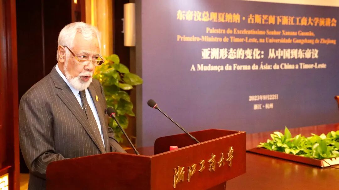 9月22日上午,来华出席杭州亚运会开幕式的东帝汶总理夏纳纳在浙江工商大学发表演讲。候任驻东帝汶大使王文丽及浙江省外办、学校师生代表等出席。演讲会由校长王永贵主持。